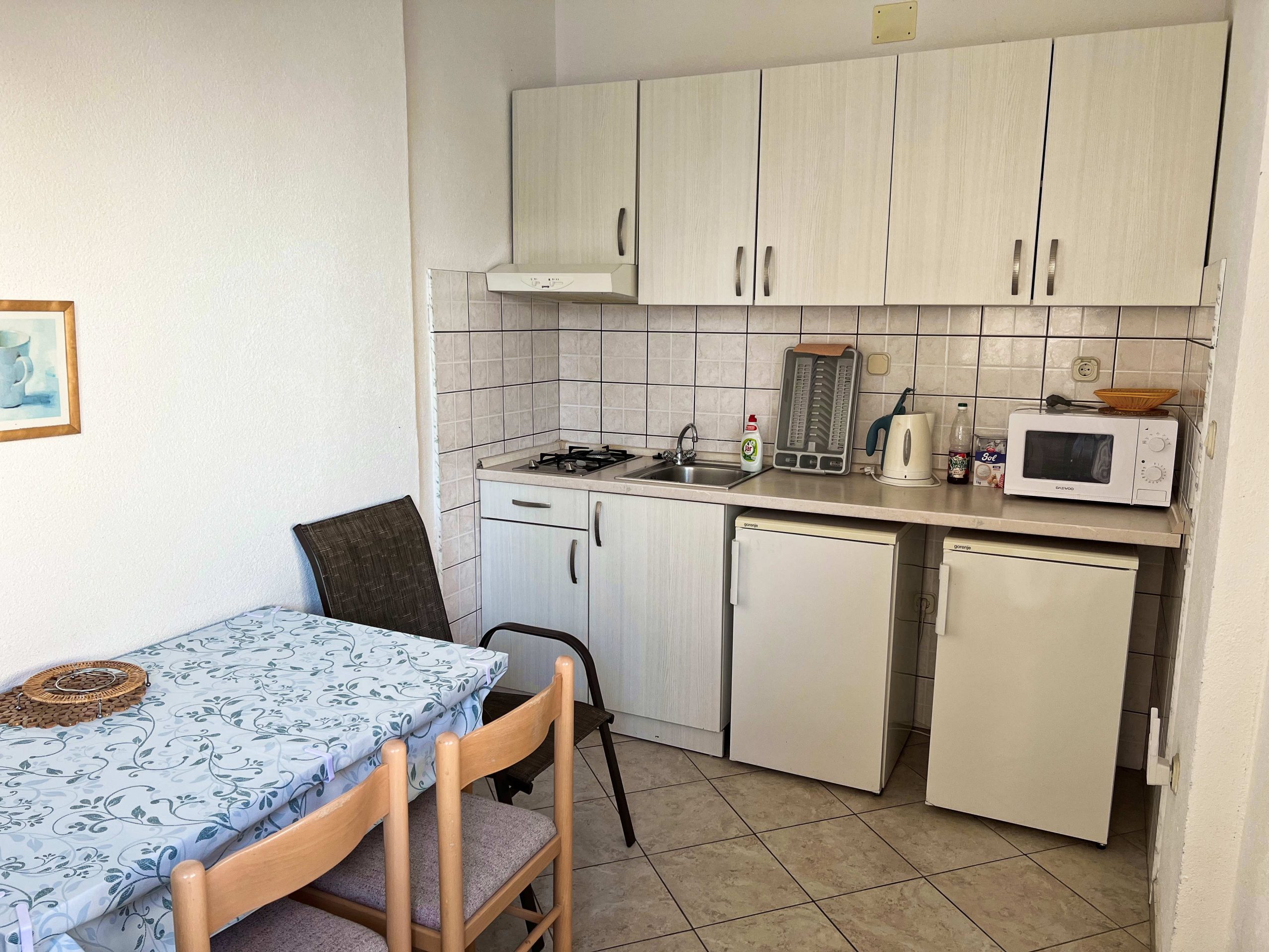 - kuchyň – vybavená pro základní vaření, rychlovarná konvice, mikrovlnná trouba, nová lednice