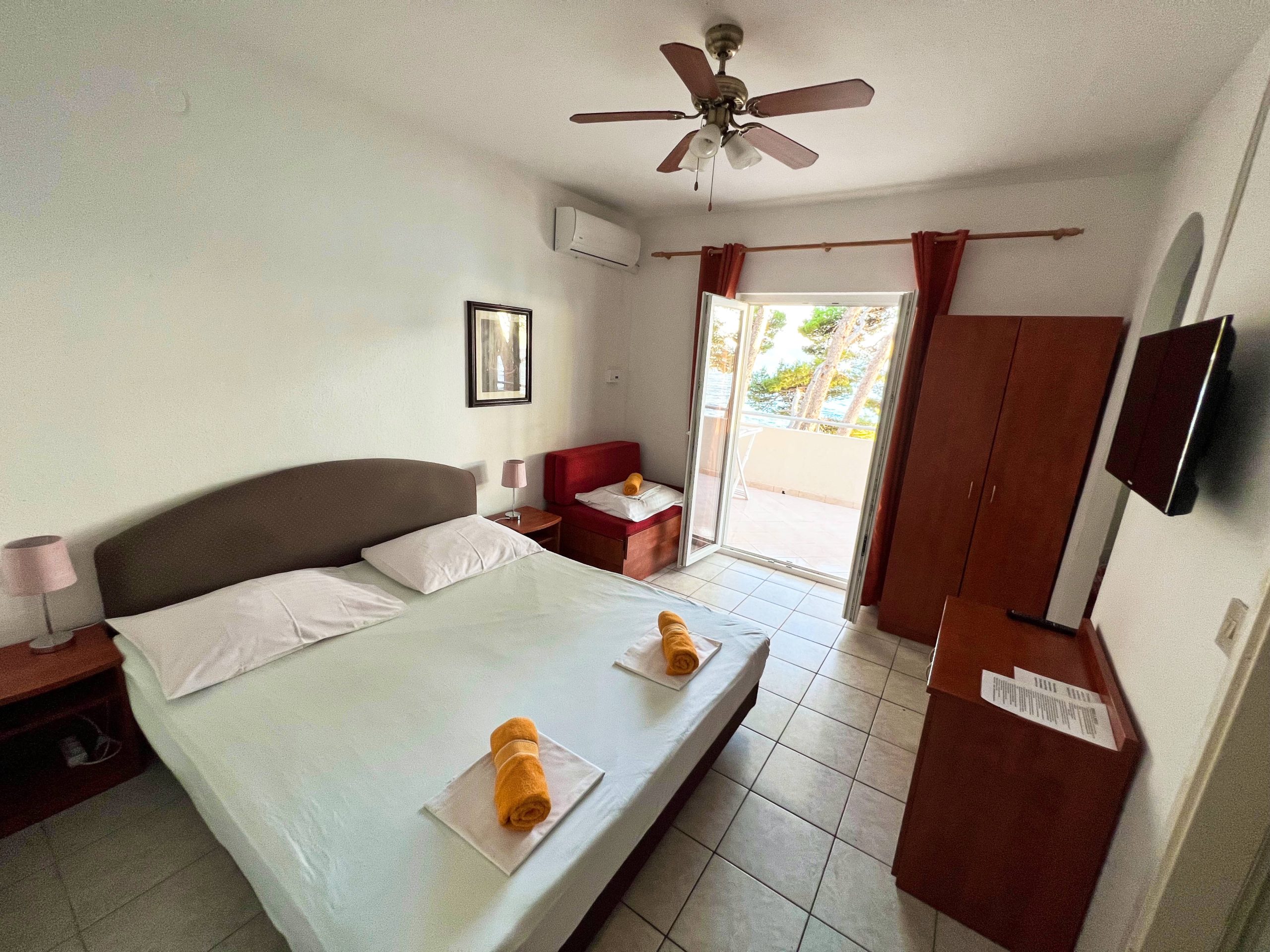- velký balkon s posezením, výhled na moře, markýza